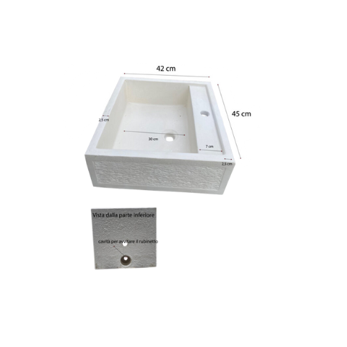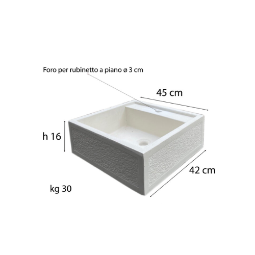 Il lavandino mensola “bocciardata” è progettato per l'installazione a piano del rubinetto, ideale per spazi esterni come giardini. Realizzato in cemento bianco e polvere di marmo, garantisce grande resistenza agli agenti atmosferici e durabilità nel tempo. Le dimensioni compatte (45x42x16 cm) e il peso di 30 kg garantiscono stabilità senza rinunciare a un design funzionale, con foro predefinito per il rubinetto che facilita l'installazione. Una soluzione robusta e pratica ambienti per esterni con esigenze di estetica e praticità.